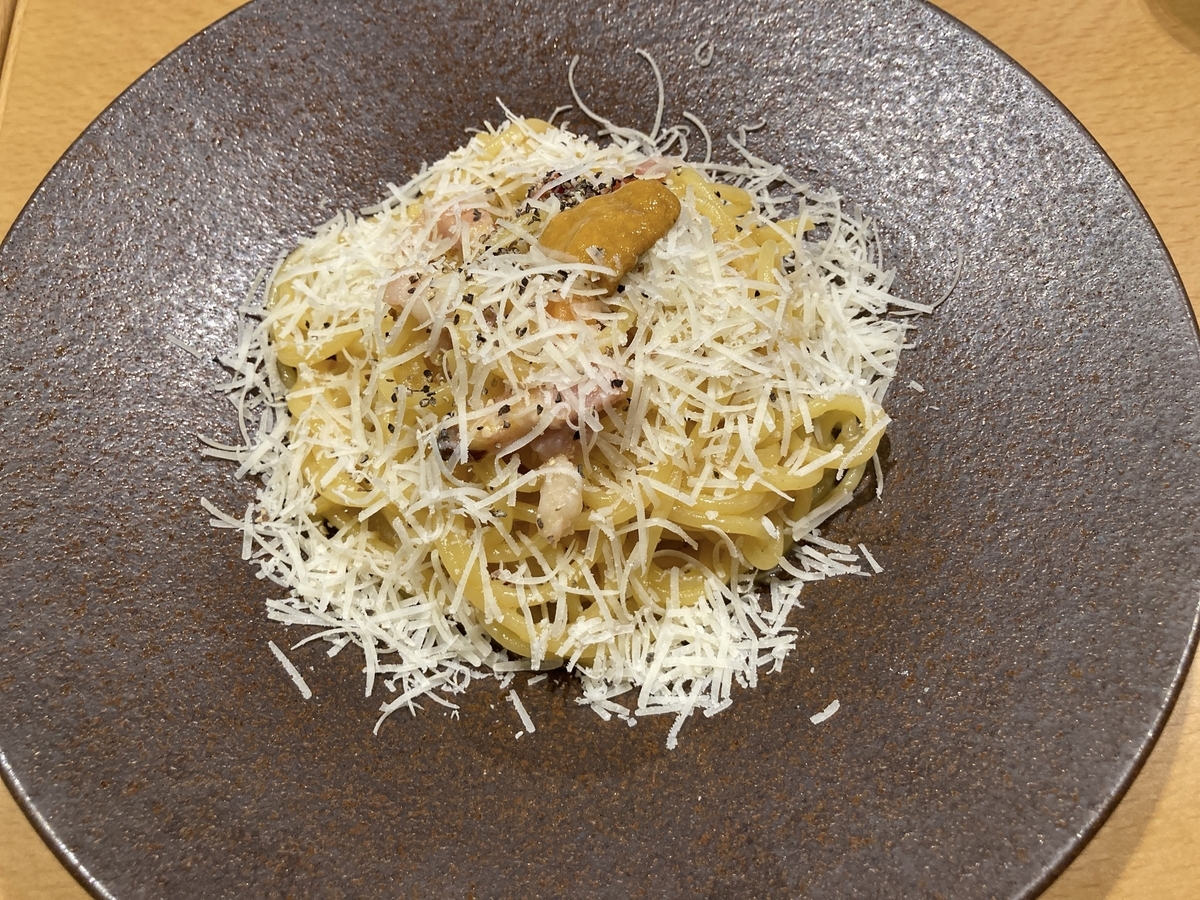 雲丹のローマ風カルボナーラのパスタセット(サラダ、スープ、パン付き)を注文しました。